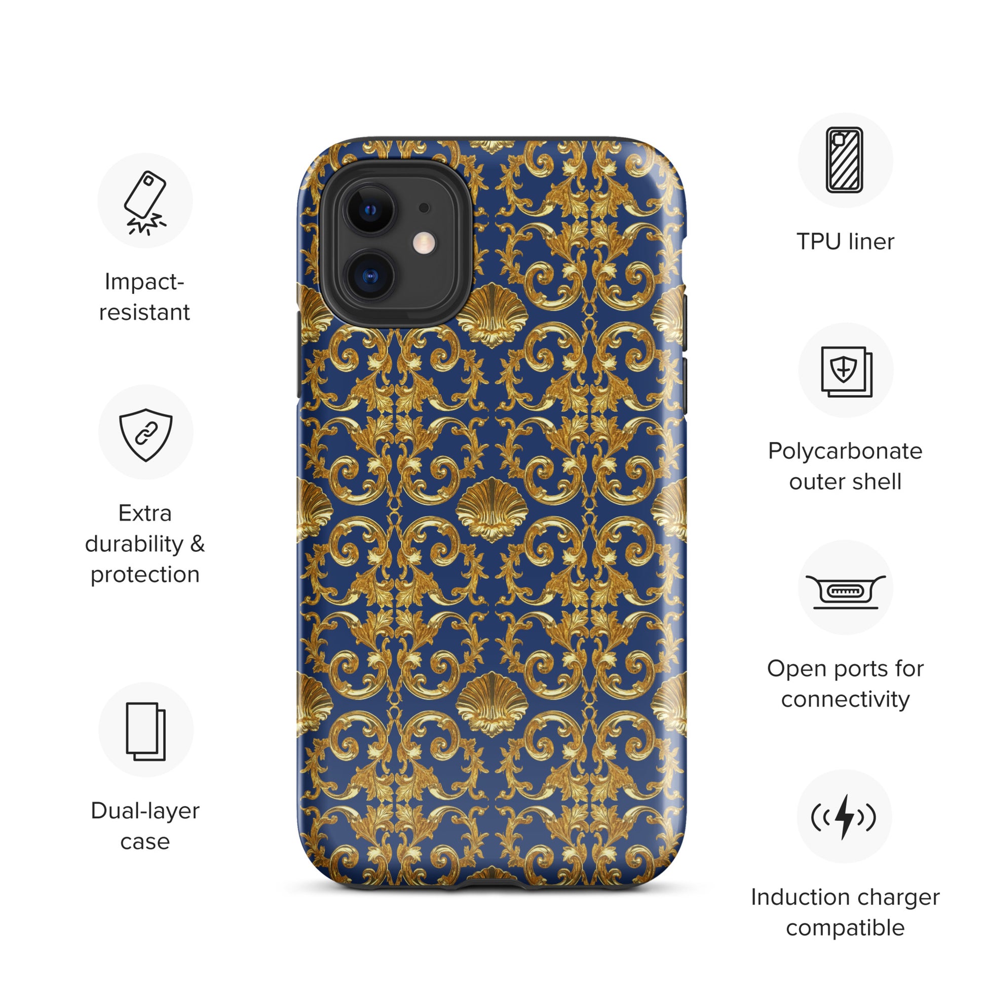 Built for everyday protection, the impact-resistant polycarbonate outer shell shields your device from drops and scratches, while the soft TPU inner lining absorbs shock for maximum security. Sleek, stylish, and resilient, it keeps your phone safe in true Baroque fashion—all year round.
